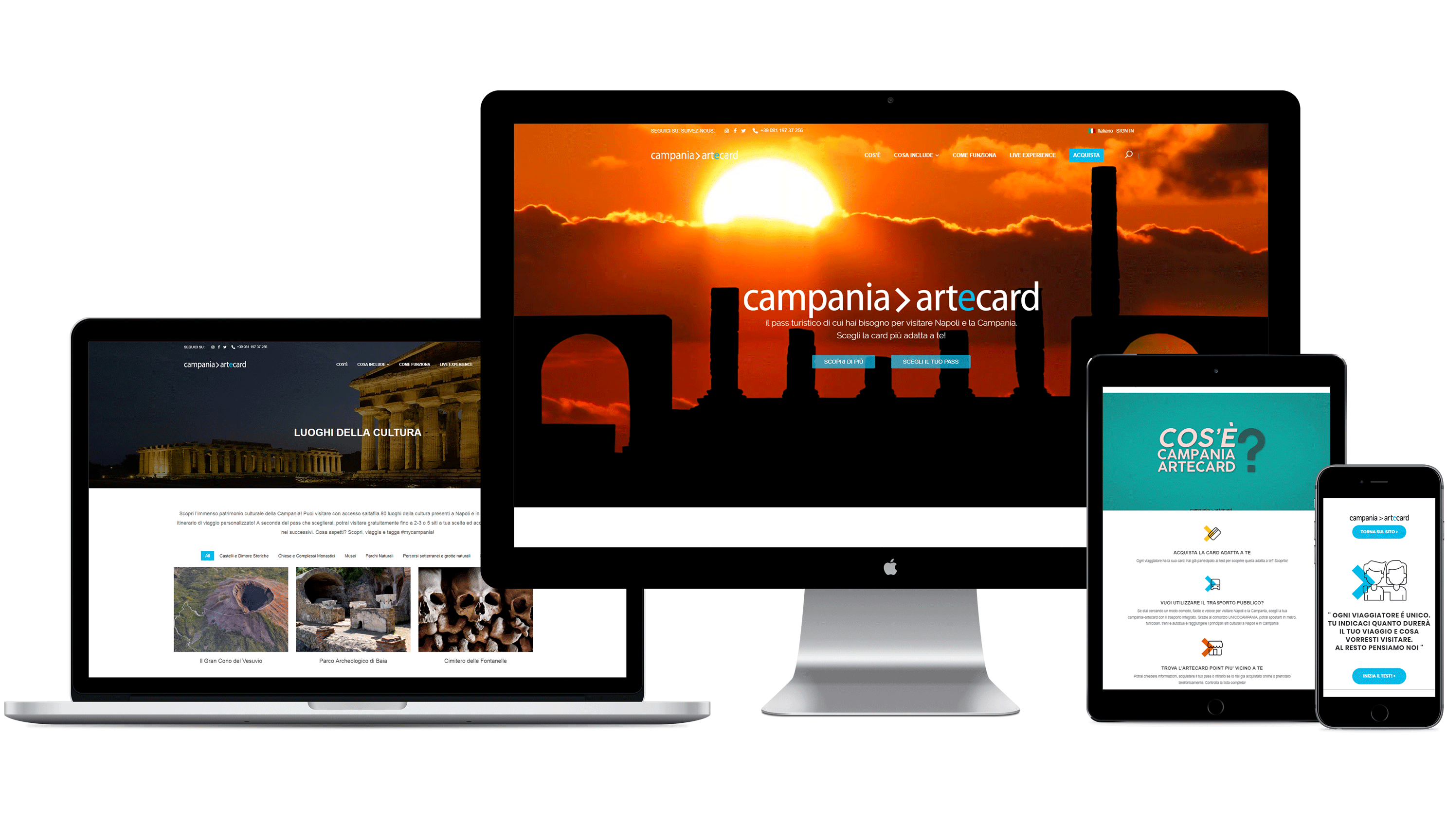 Come un lungo tour per le meraviglie della Campania, il viaggio di collaborazione della 3d0 con il team della Scabec per la realizzazione del progetto di restyling del sito web campaniartecard.it è stato intenso nel cammino ed emozionante nel risultato: un portale turistico dal forte impatto visivo, ricco di contenuti multimediali, impreziosito inoltre dal sistema interattivo discover.campaniartecard.it, progettato appositamente per agevolare gli utenti nella scelta della card turistica che risponde meglio ai loro bisogni di viaggio.
